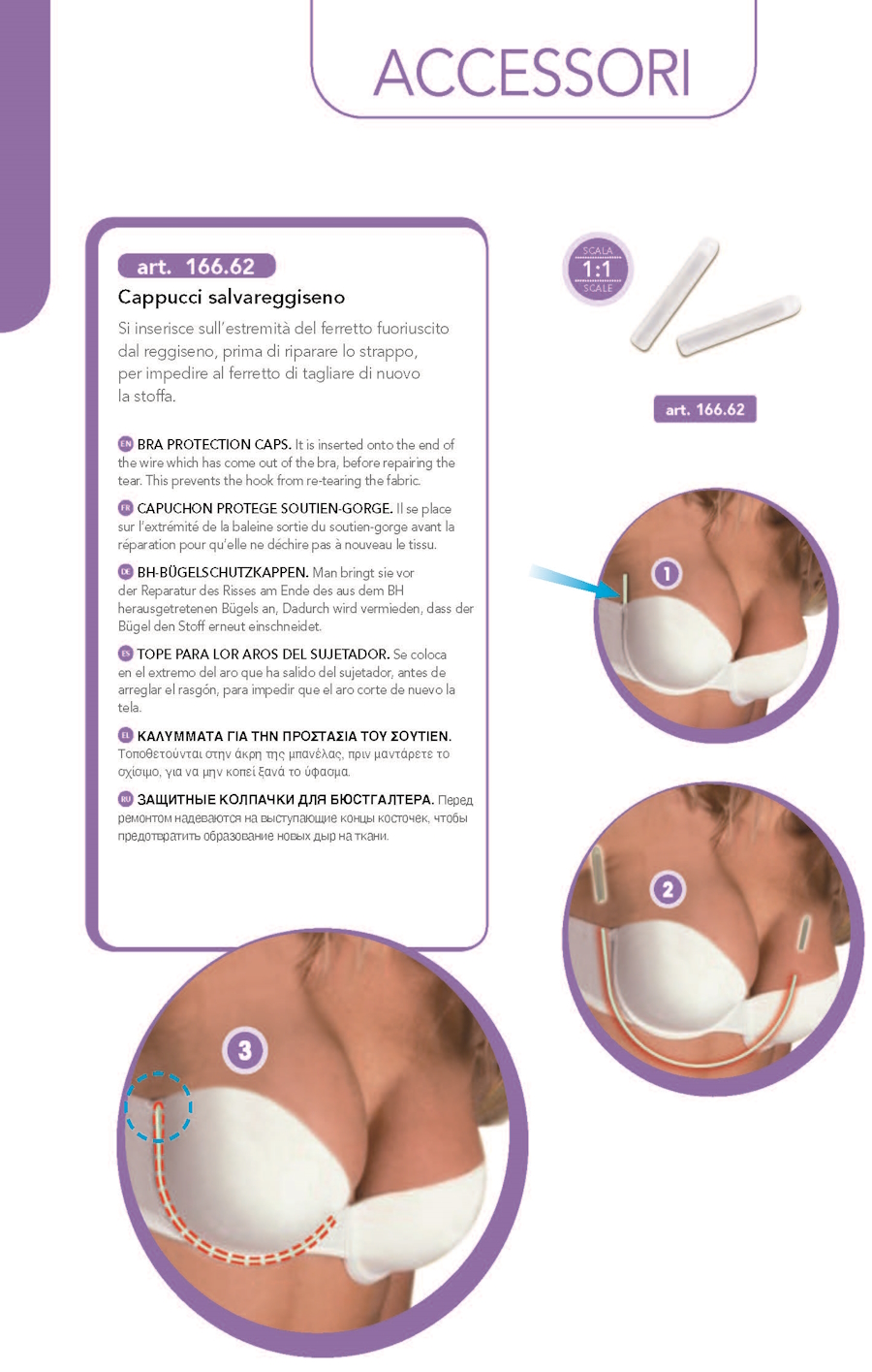 Si inserisce sull’estremità del ferretto fuoriuscito dal reggiseno, prima di riparare lo strappo. per impedire al ferretto di tagliare di nuovo la stoffa.