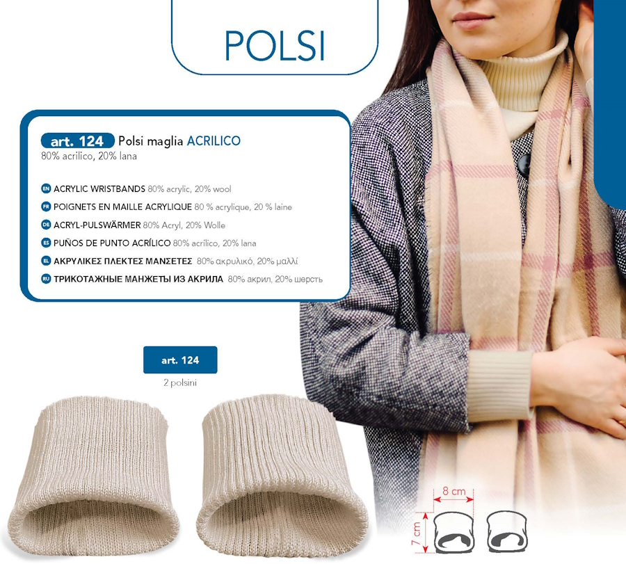 I Polsini Maglia acrilico, sono una soluzione economica per sostituire i polsini logori o danneggiati, presenti su una ampia varietà di capi d’abbigliamento: felpe, pigiami, tute e giubbotti, che all’occorrenza saranno rinnovati con dei polsini della stessa tinta, consistenza e densità.